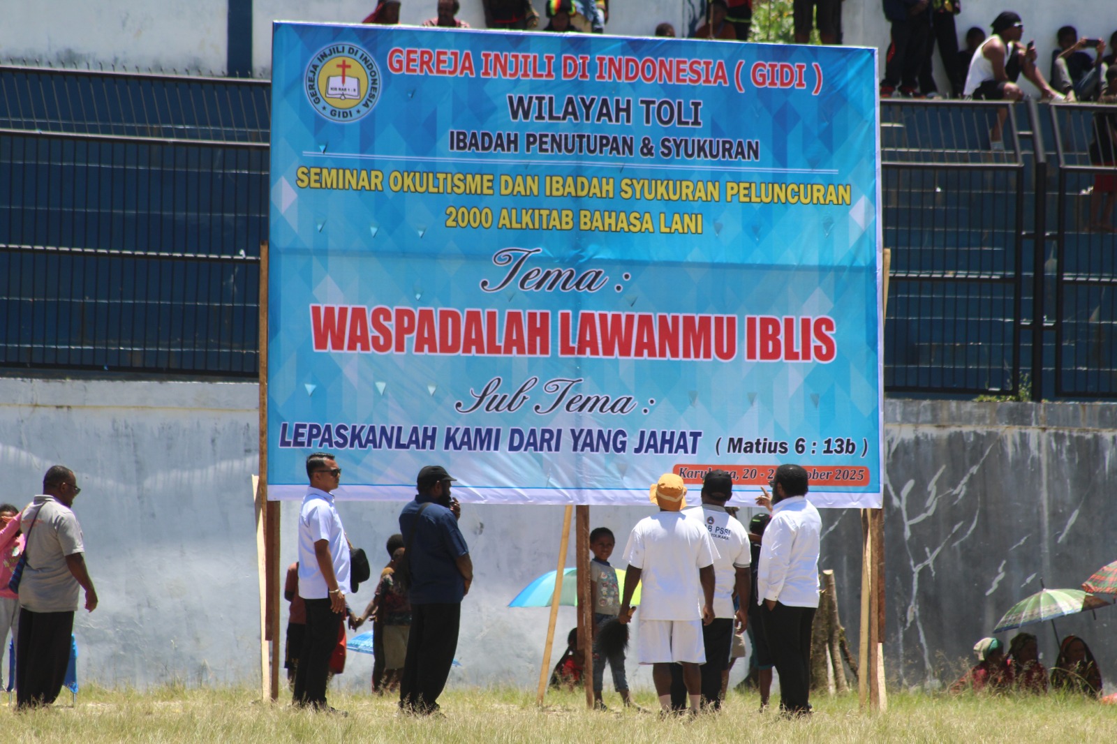 Karubaga, Tolikara – Ribuan umat Gereja Injili di Indonesia (GIDI) dari 18 klasis yang tergabung dalam Wilayah GIDI Toli memadati Lapangan Pendidikan Karubaga, Selasa (21/10/2025). Mereka datang dengan penuh sukacita untuk mengikuti Ibadah Akbar penutupan Seminar Okultisme, yang sekaligus menjadi momentum peluncuran 2.000 eksemplar Alkitab dalam Bahasa Lani — bahasa ibu yang hidup dan tumbuh di tengah masyarakat Lani Pegunungan Tengah Papua.