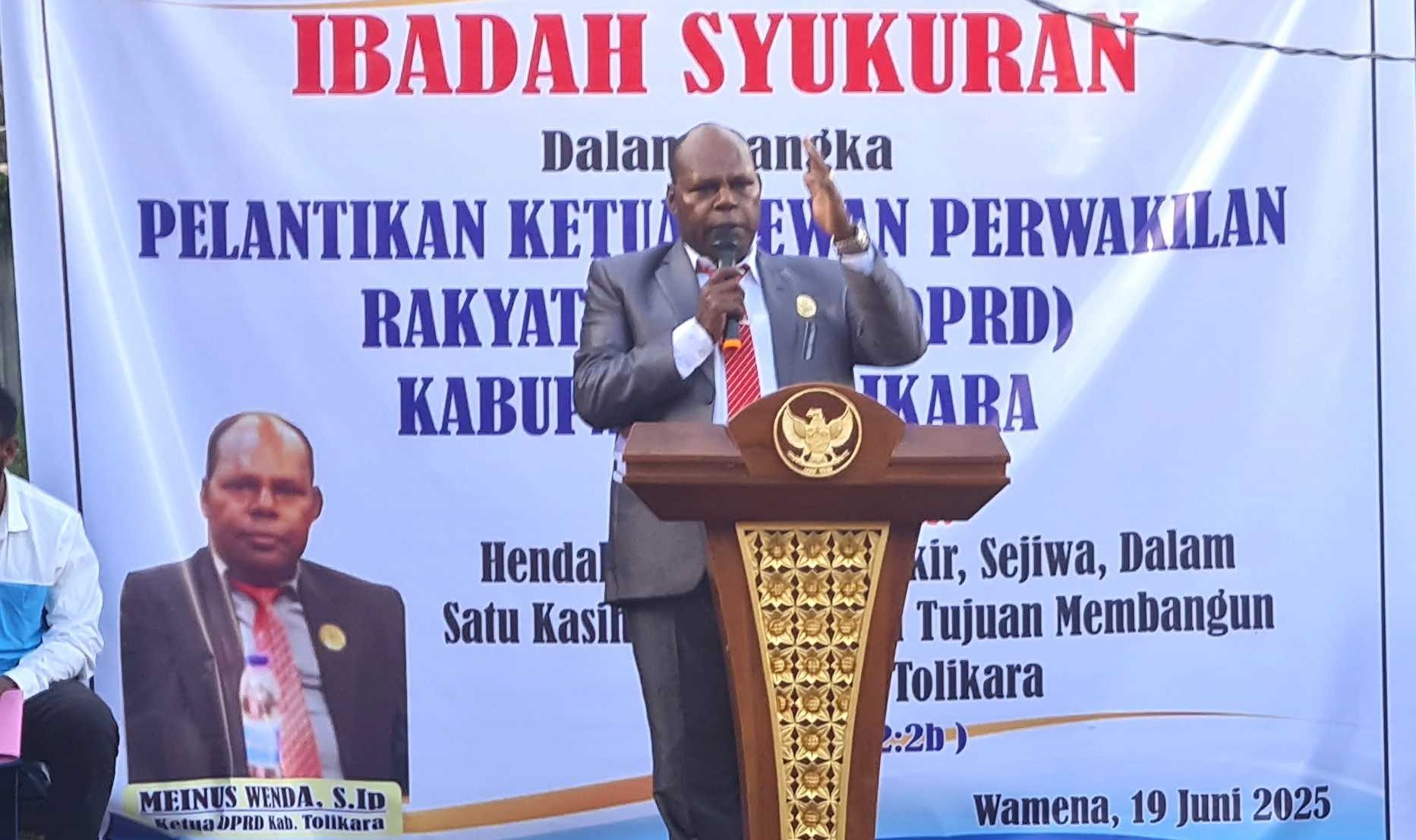 Acara syukuran Ketua DPRK Tolikara periode 2024-2025, Meinus Y. Wenda, SIP diawali dengan ibadah di bawah tema: “Hendaklah sehati, sepikir, sejiwa, dalam satu kasih satu jiwa, tujuan membangun Kabupaten Tolikara” (Filipi 2 : 2b).