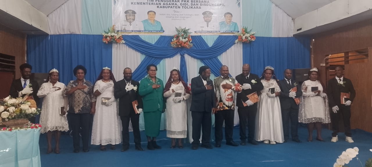 Karubaga,Tolikara — Menjelang perayaan Natal, Pemerintah Kabupaten Tolikara bersama Tim Penggerak PKK menggelar pernikahan massal bagi lima pasangan warga Tolikara. Acara pernikahan tersebut digelar di gedung Gereja GIDI Ebenhaezar Karubaga kamis,11/12/2025 kemarin. Kegiatan yang dipusatkan di Karubaga ibukota Kabupaten Tolikara ini menjadi momentum penuh sukacita sekaligus wujud kepedulian pemerintah dalam membantu masyarakat memperoleh keabsahan pernikahan secara gereja dan negara.