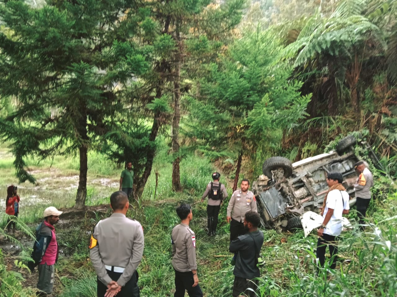 Kendaraan Daihatsu Triton warna putih produksi tahun 2015 itu mengalami kerusakan parah pada bagian body dan kaca. Menindaklanjuti laporan warga, aparat kepolisian segera tiba di lokasi bersama tim medis untuk melakukan proses evakuasi. Para korban dievakuasi menggunakan ambulans ke RSUD Tolikara, sementara dua jenazah korban langsung dijemput oleh pihak keluarga untuk dimakamkan di kampung masing-masing.